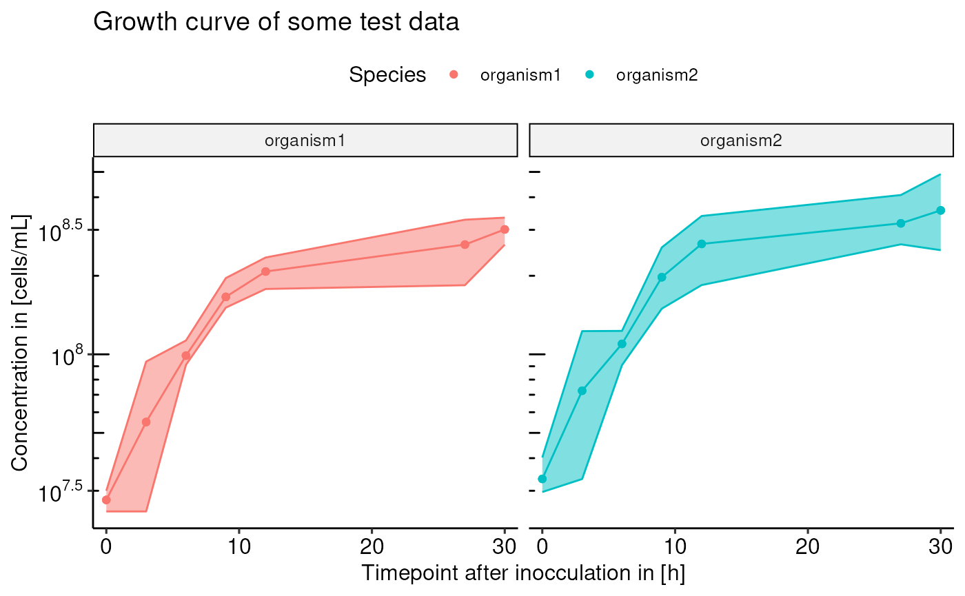 ggplot2::labs(title = "Growth curve of some test data", x = "Timepoint after inocculation in [h]", y = "Concentration in [cells/mL]") +
